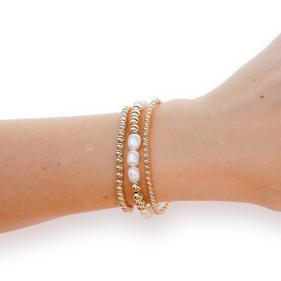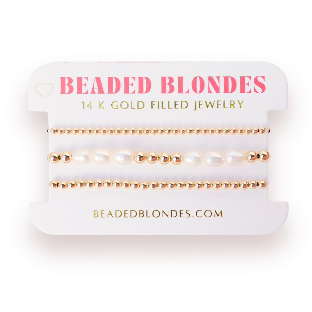The perfect every day stack! Includes: * 3mm Beaded Bracelet * 4mm Beaded Bracelet * Pearl Beaded Bracelet