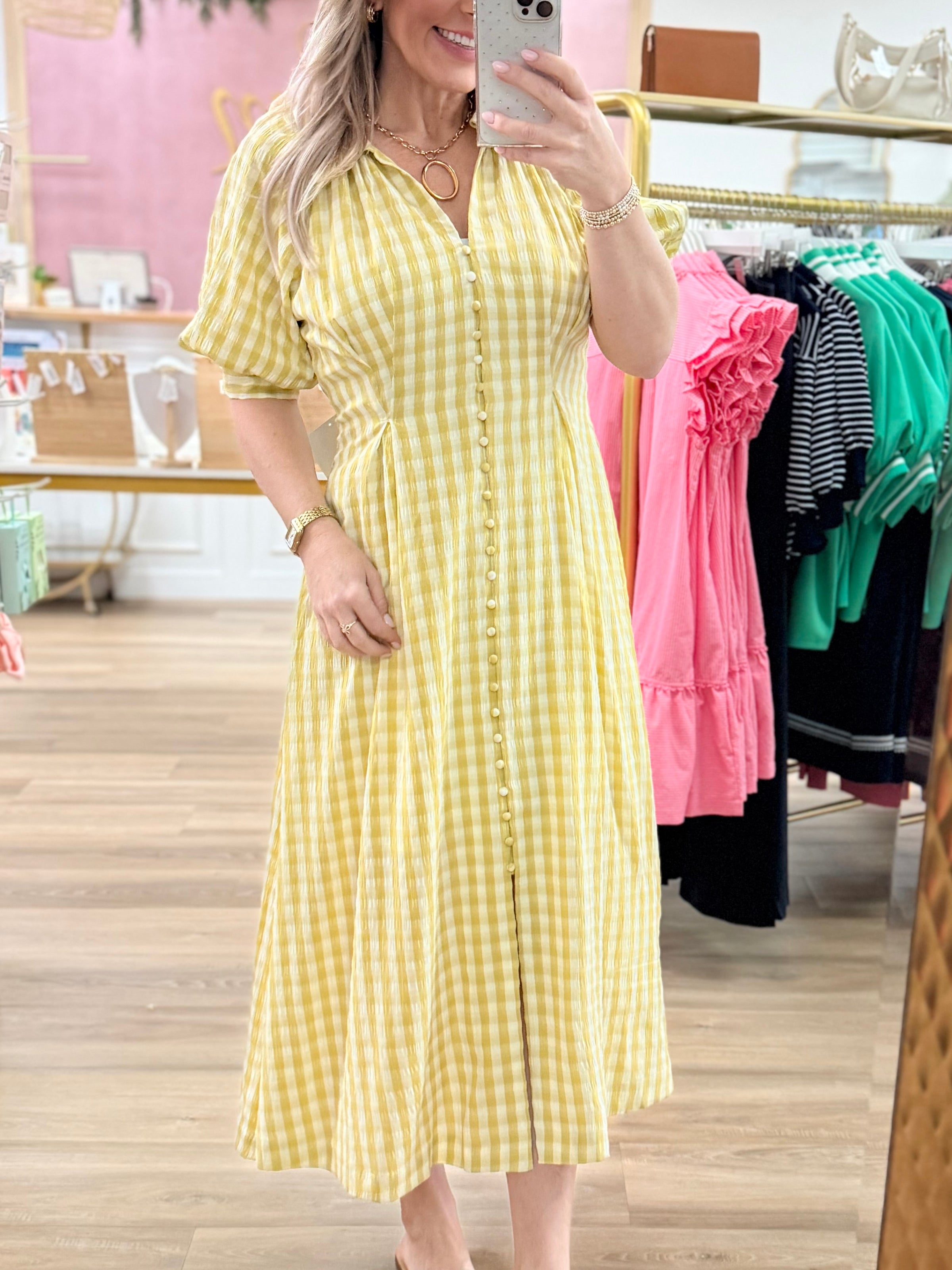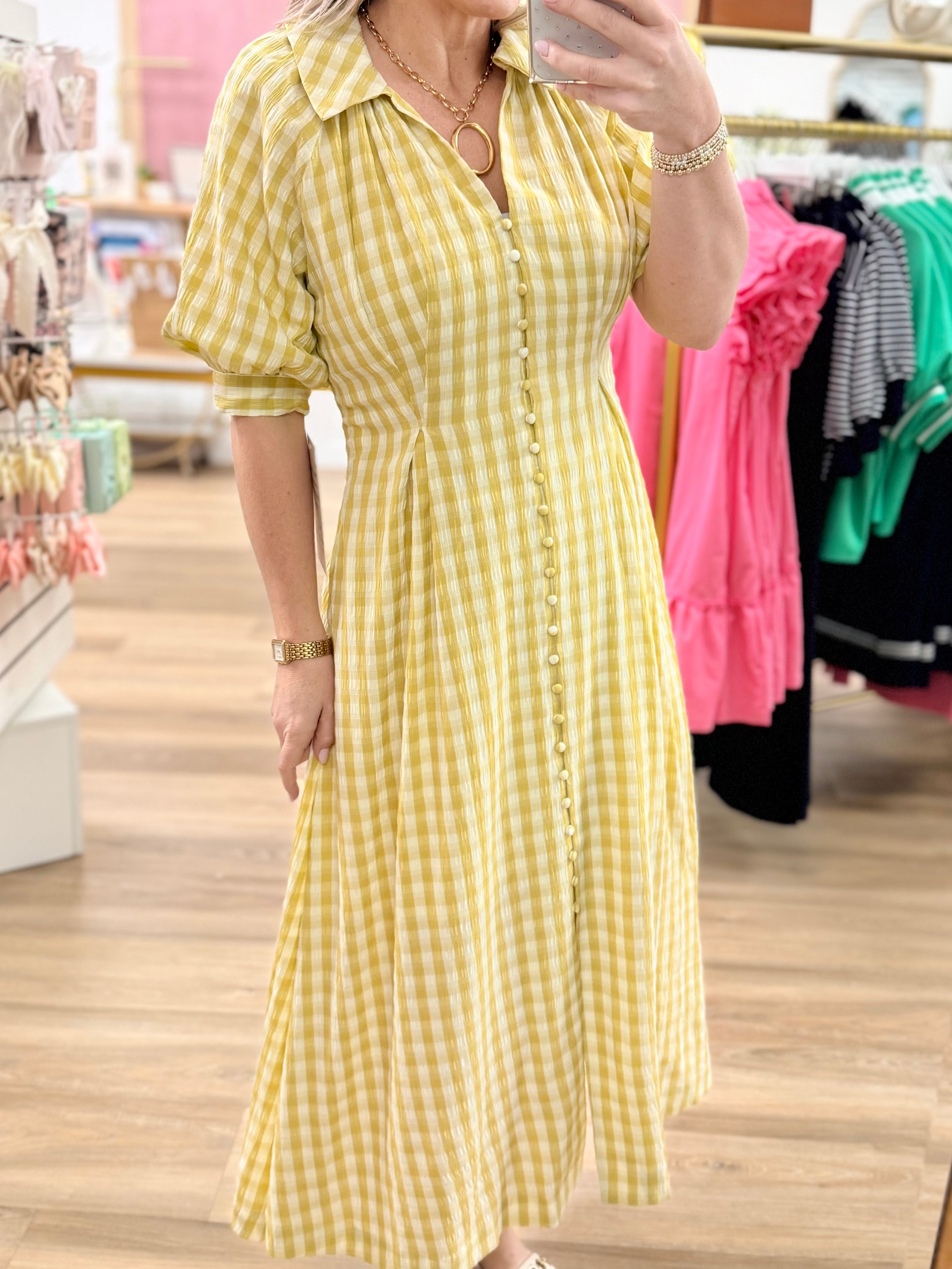 -puff sleeves -V-neck -Fitted waist -A-line hem