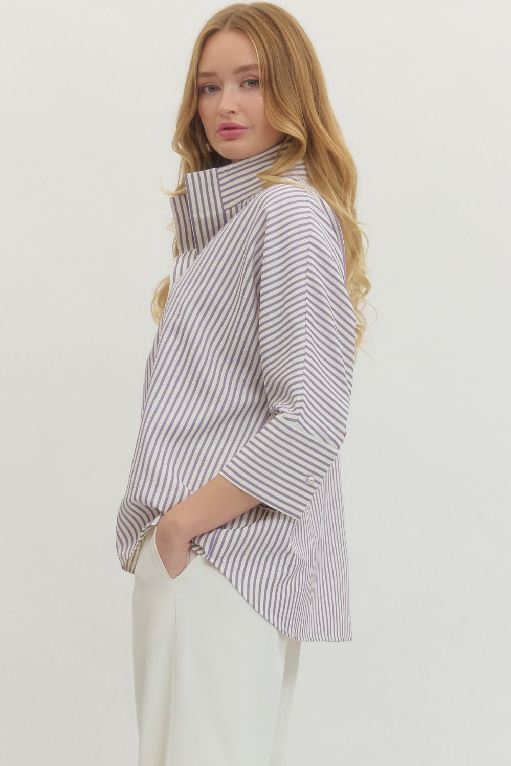 Striped 3/4 sleeve top featuring wide collar with button closure at front. Button detail at sleeve cuffs.