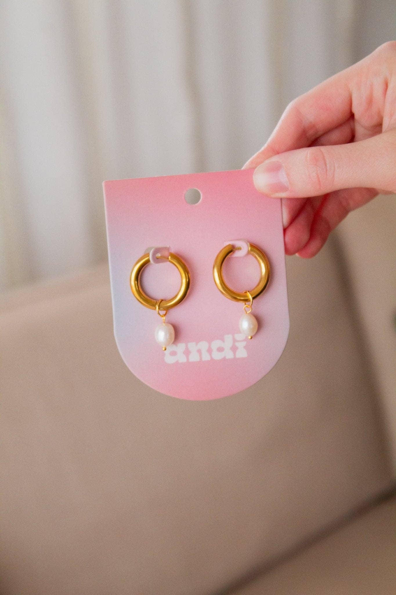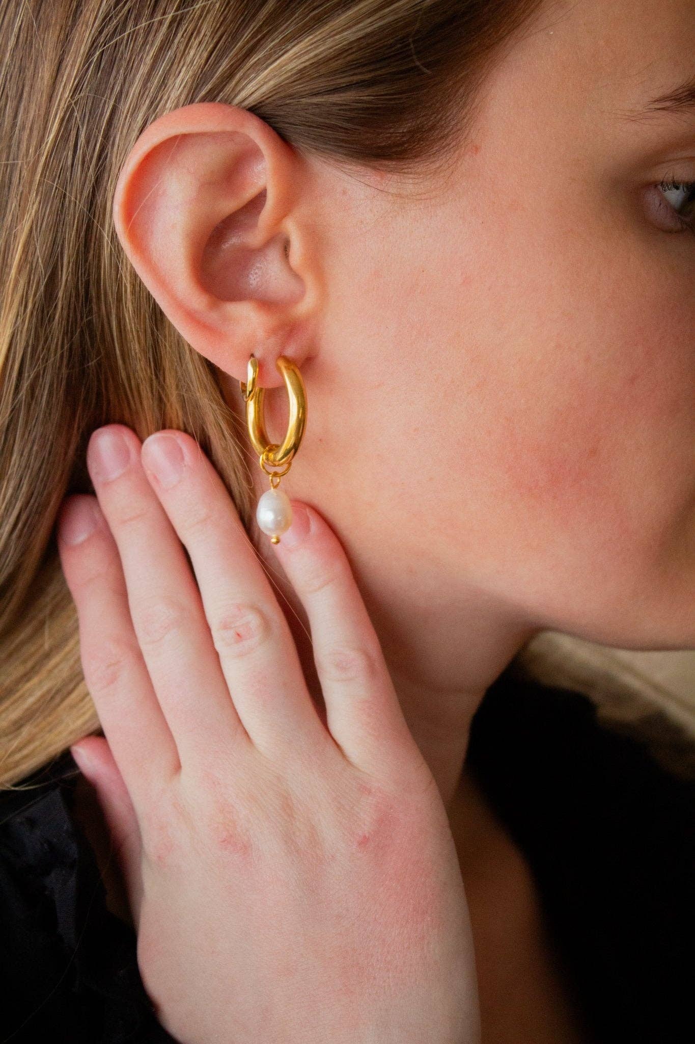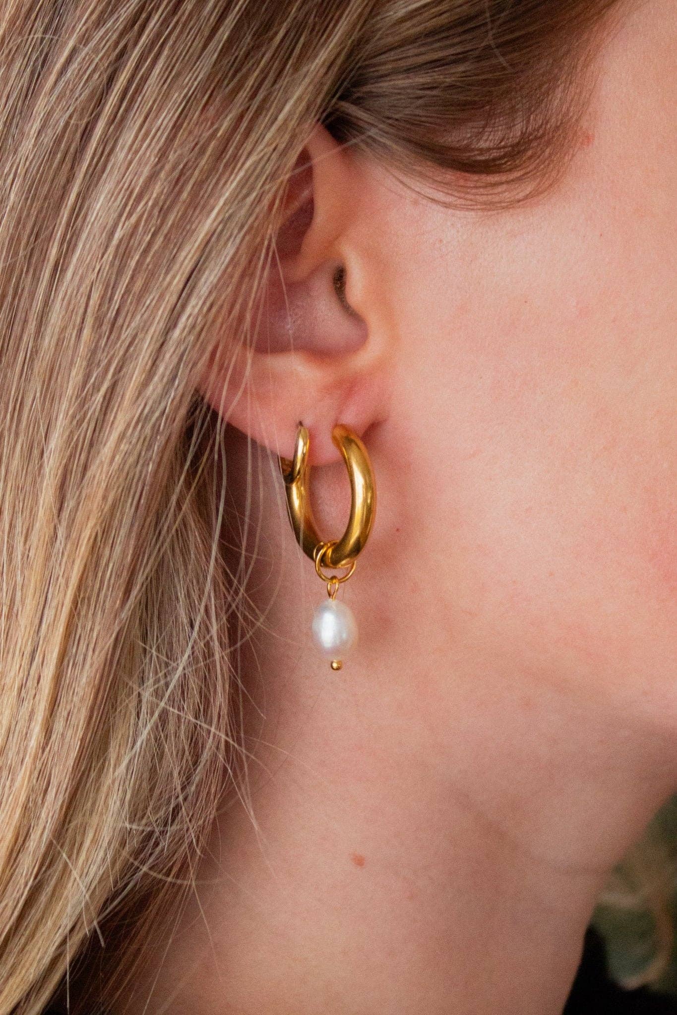 They have a pearl dangle charm making them a perfect mix of hoop and dangly earrings. Because they're 18k gold electroplated stainless steel they are hypoallergenic and perfect for any occasion!