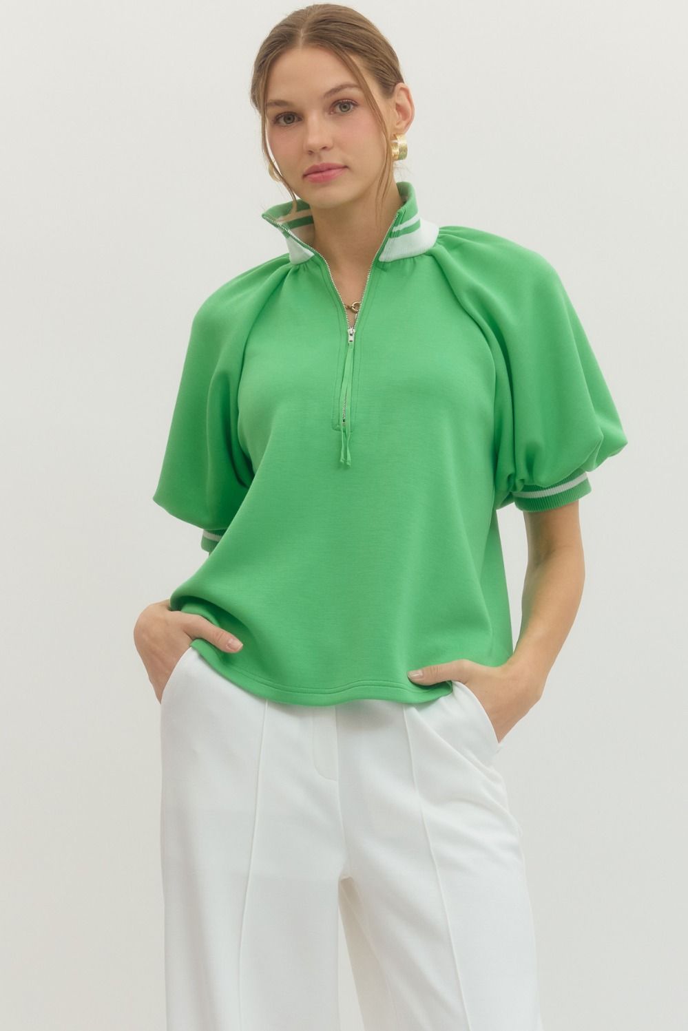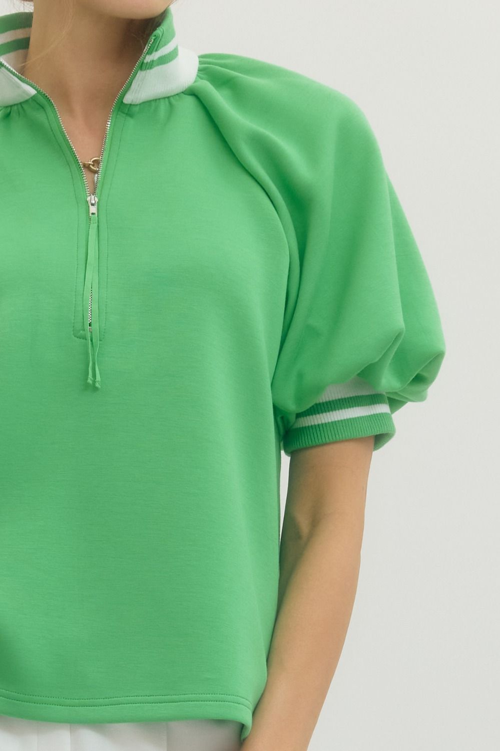 Solid short puff raglan sleeve knit top featuring stand collar with half zip closure. Contrast striped rib trim at collar and cuffs.