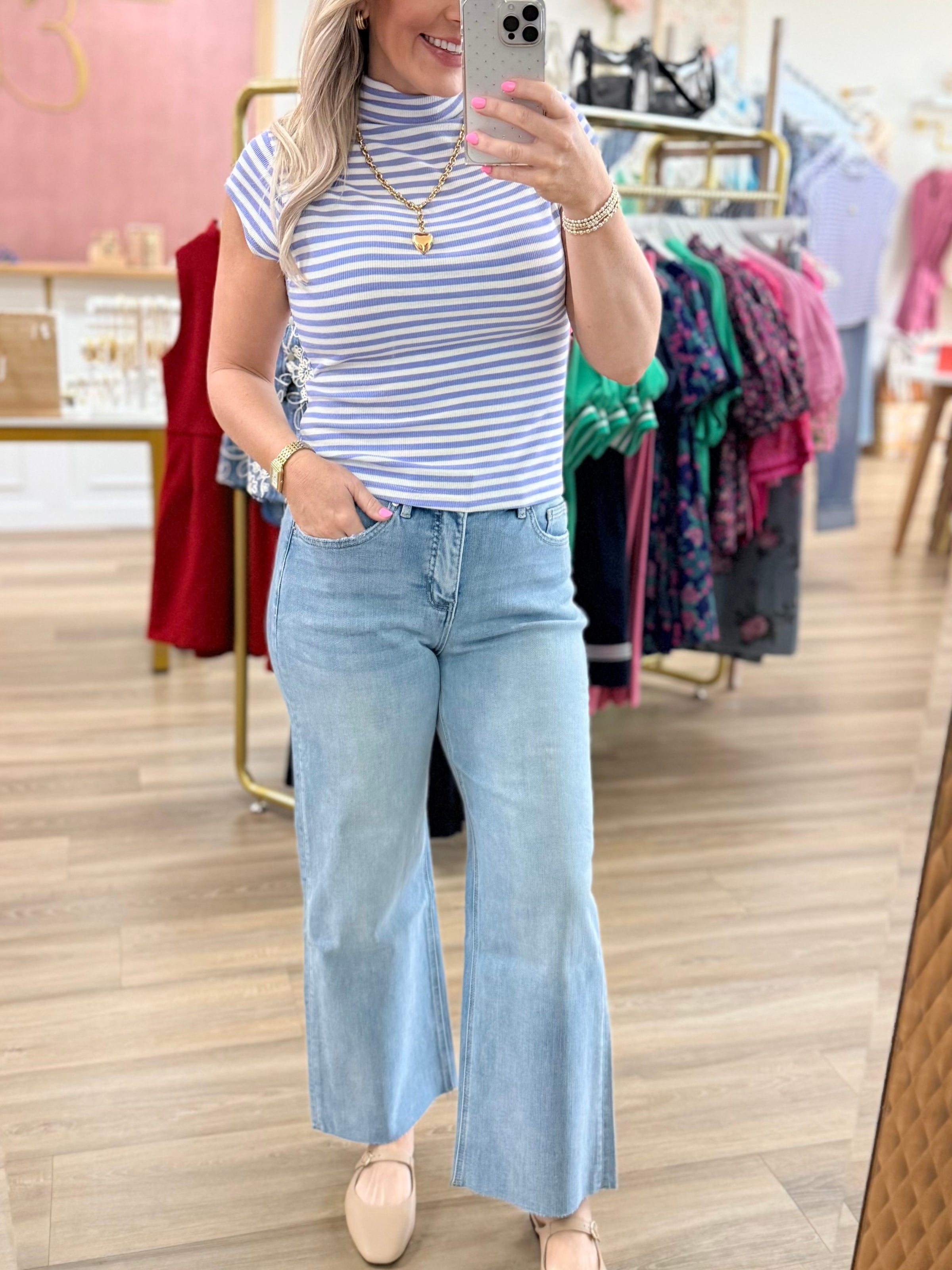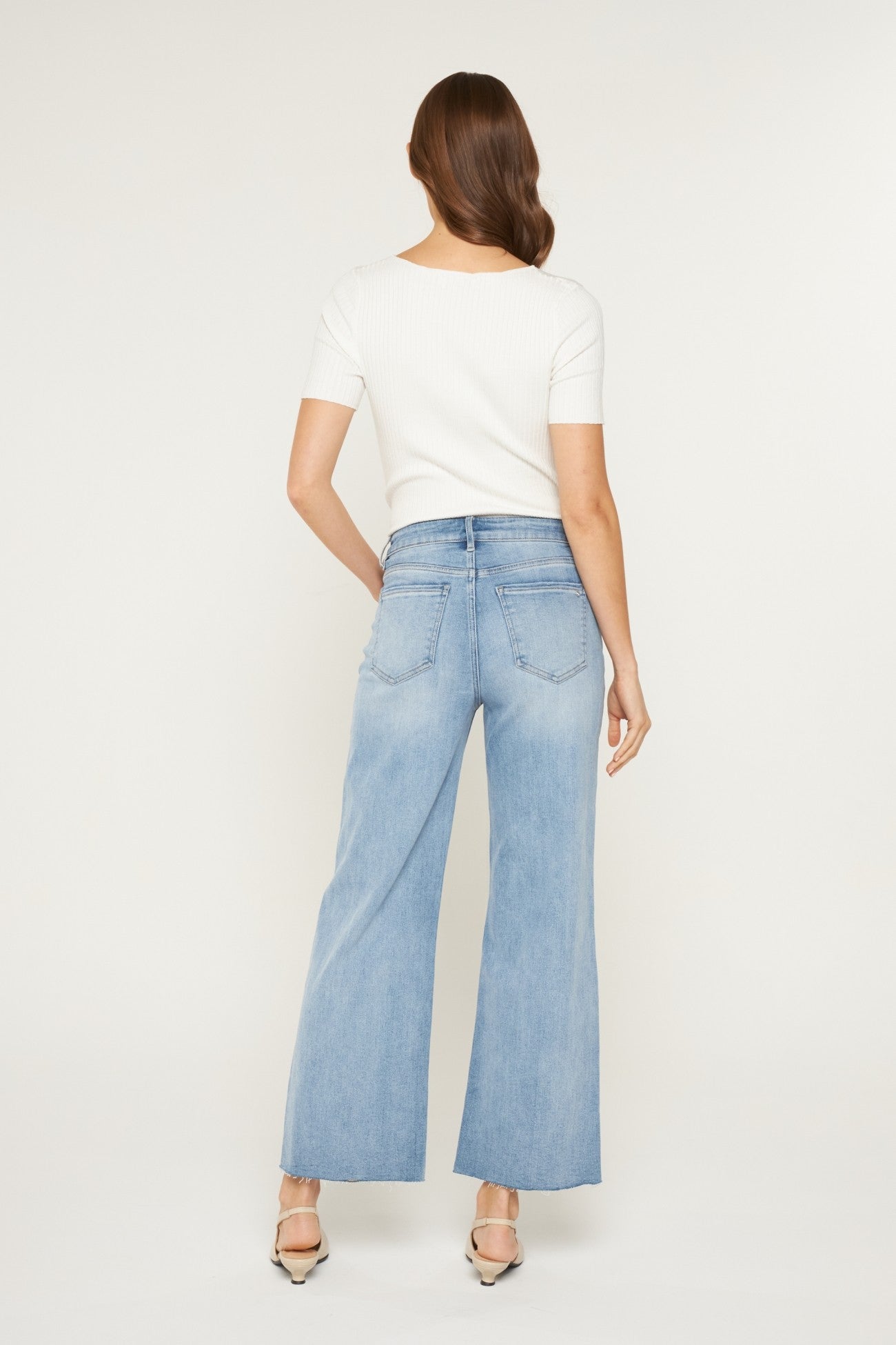HIGH RISE WIDE RAW HEM 93% COTTON, 5% POLY, 2% SPANDEX TUMMY TUCK FRONT RISE: 10 1/2" INSEAM: 28" LEG OPENING: 20"