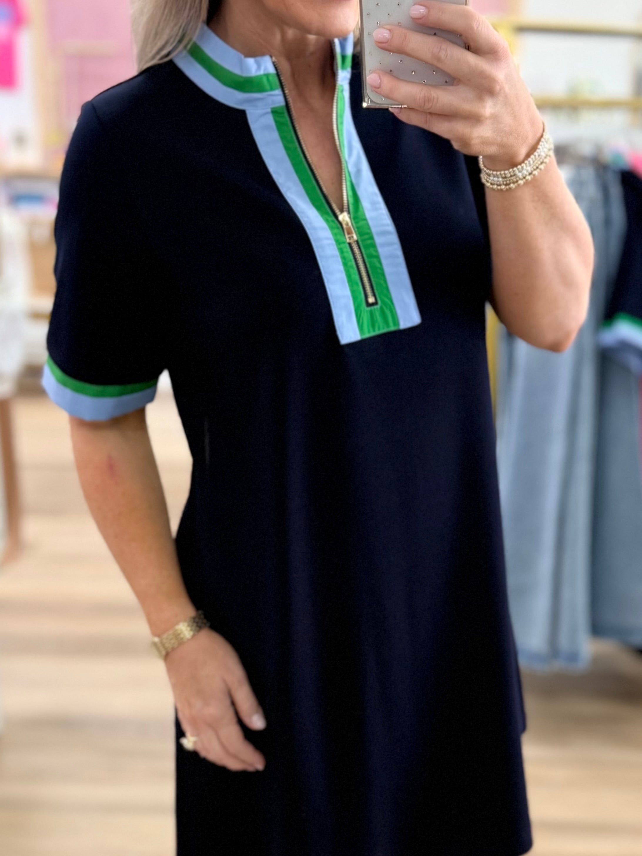 Short sleeves front zip up casual dress with contrast accent, mock neck, side pockets.