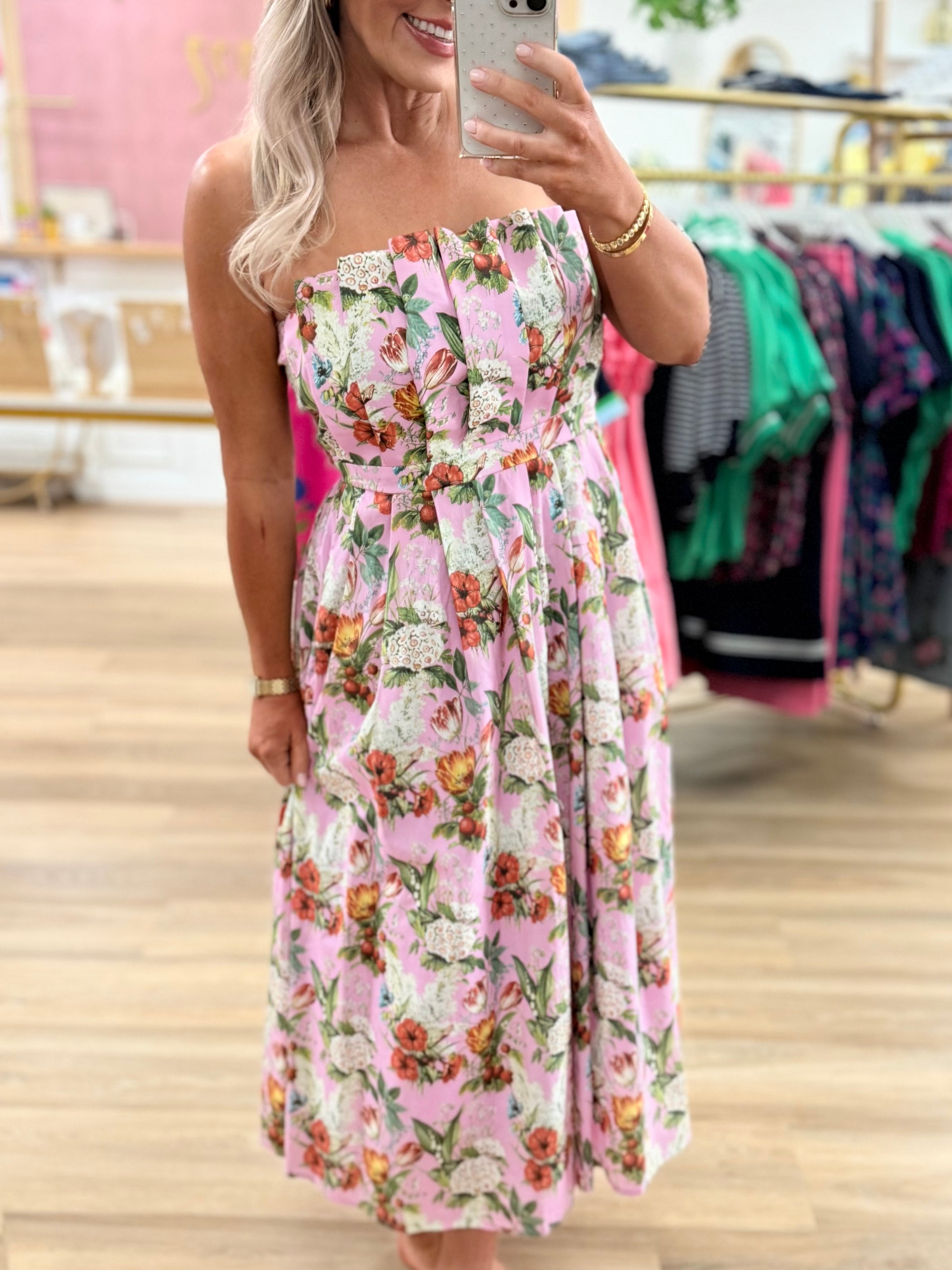 Pink Floral Strapless Midi