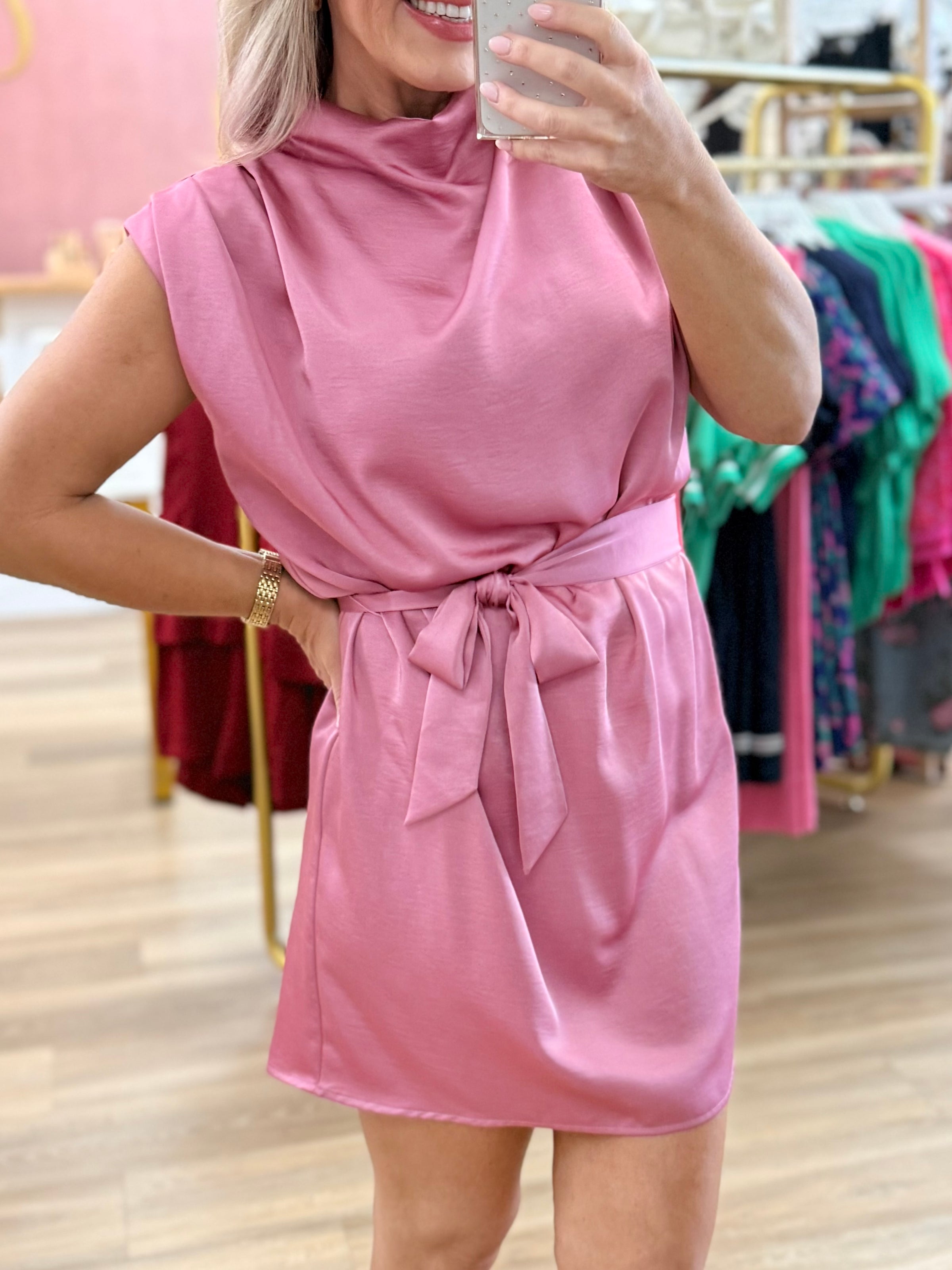 Pink Satin Mock Neck Dress