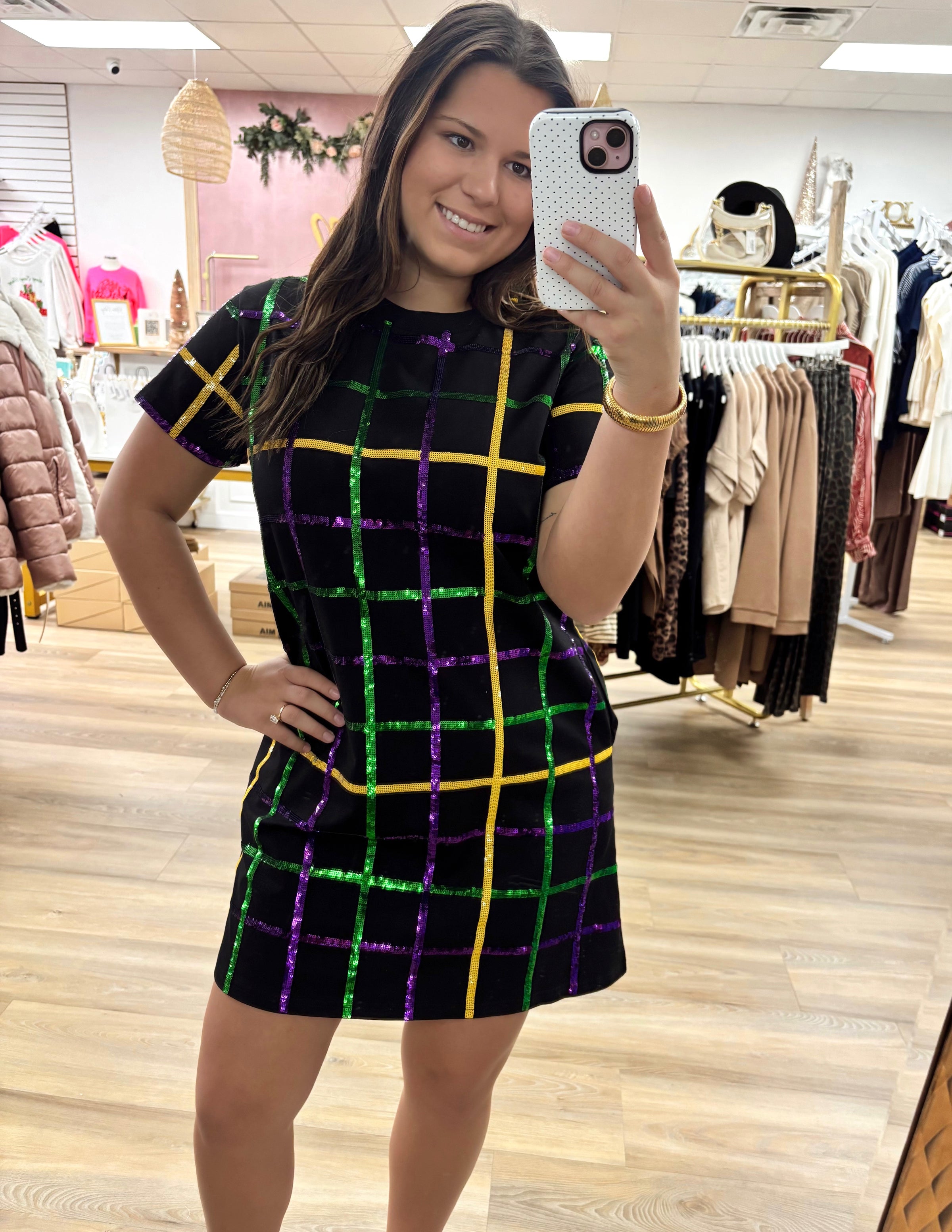 Sequin Mambo Mardi Gras T-Shirt Dress w/ Pockets.