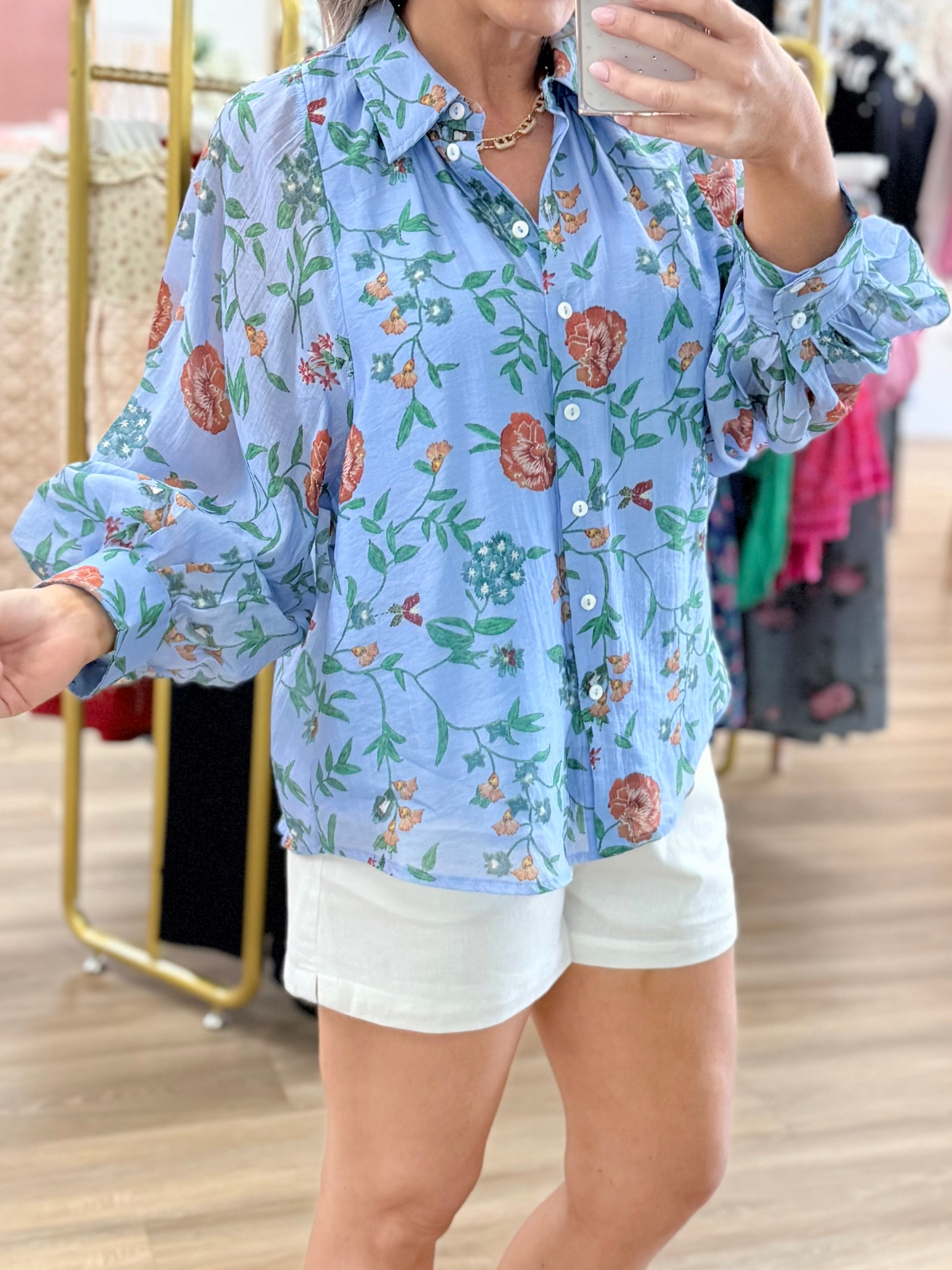 Floral print long sleeve top featuring button closure at front. Shirt collar. Buttoned cuffs. Lined.