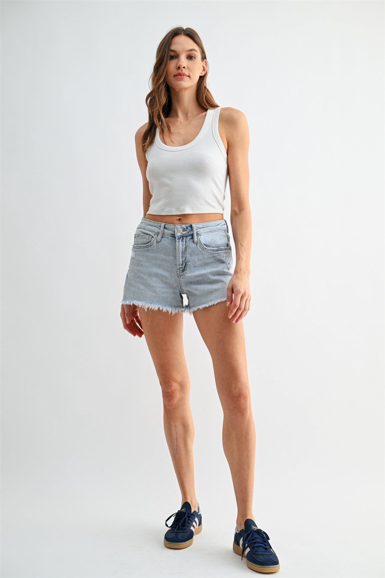 HIGH-RISE SHORTS RAW HEM 92% COTTON, 6% POLY, 2% SPAN FRONT RISE: 10'' INSEAM: 3 1/2'' LEG OPENING: 24''