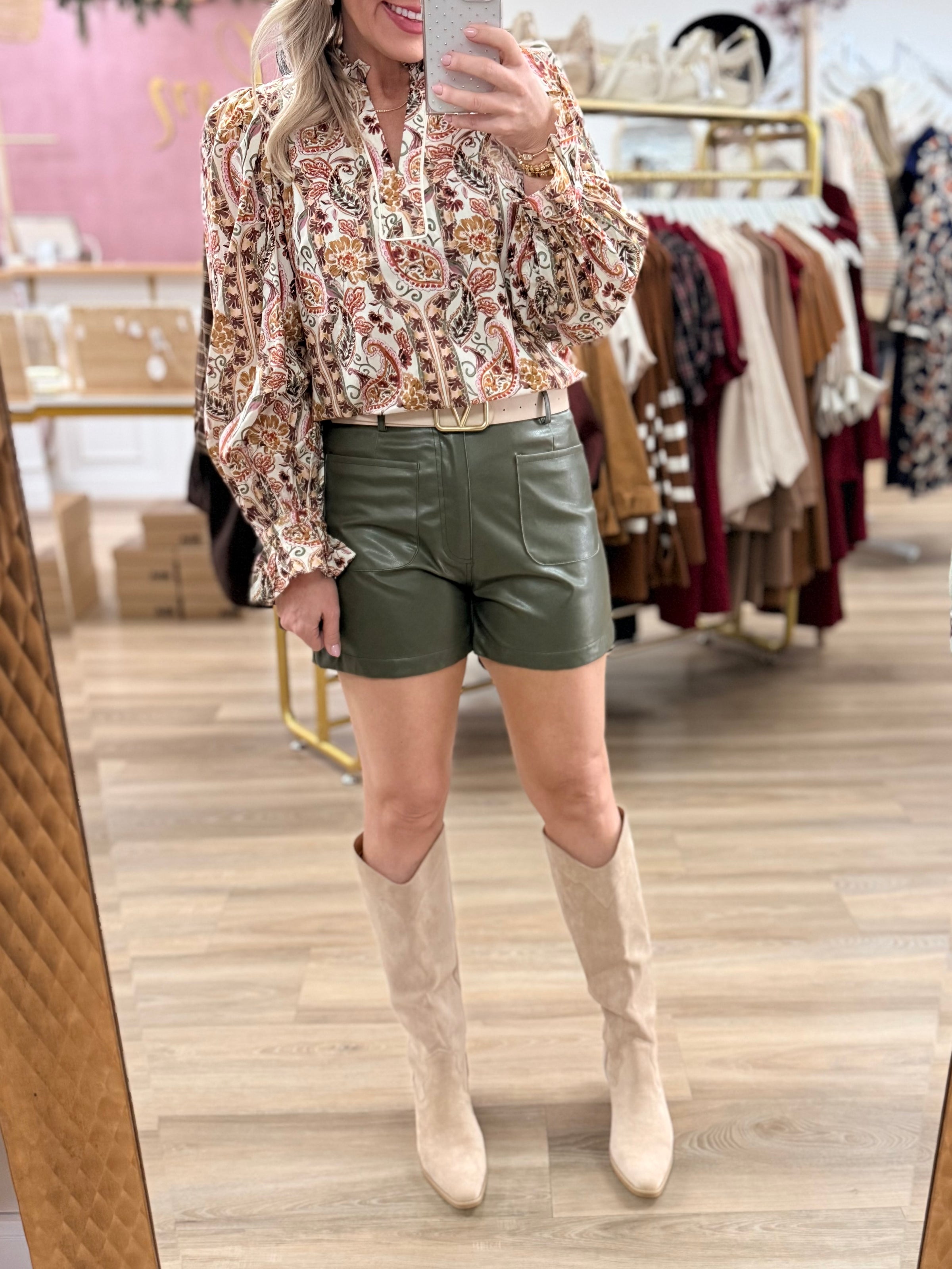 Paisley print long sleeve top featuring ruffled band collar V-neck. Buttoned cuffs with ruffle edge.