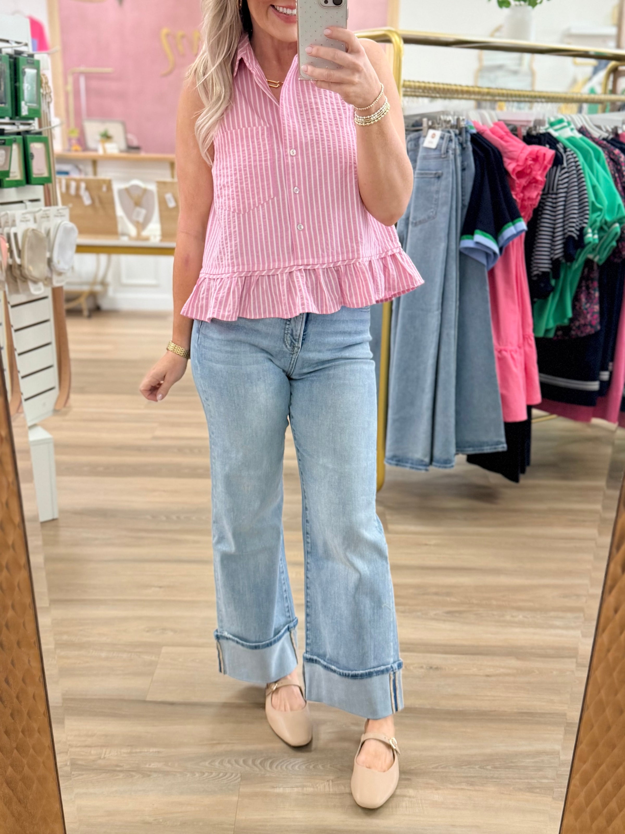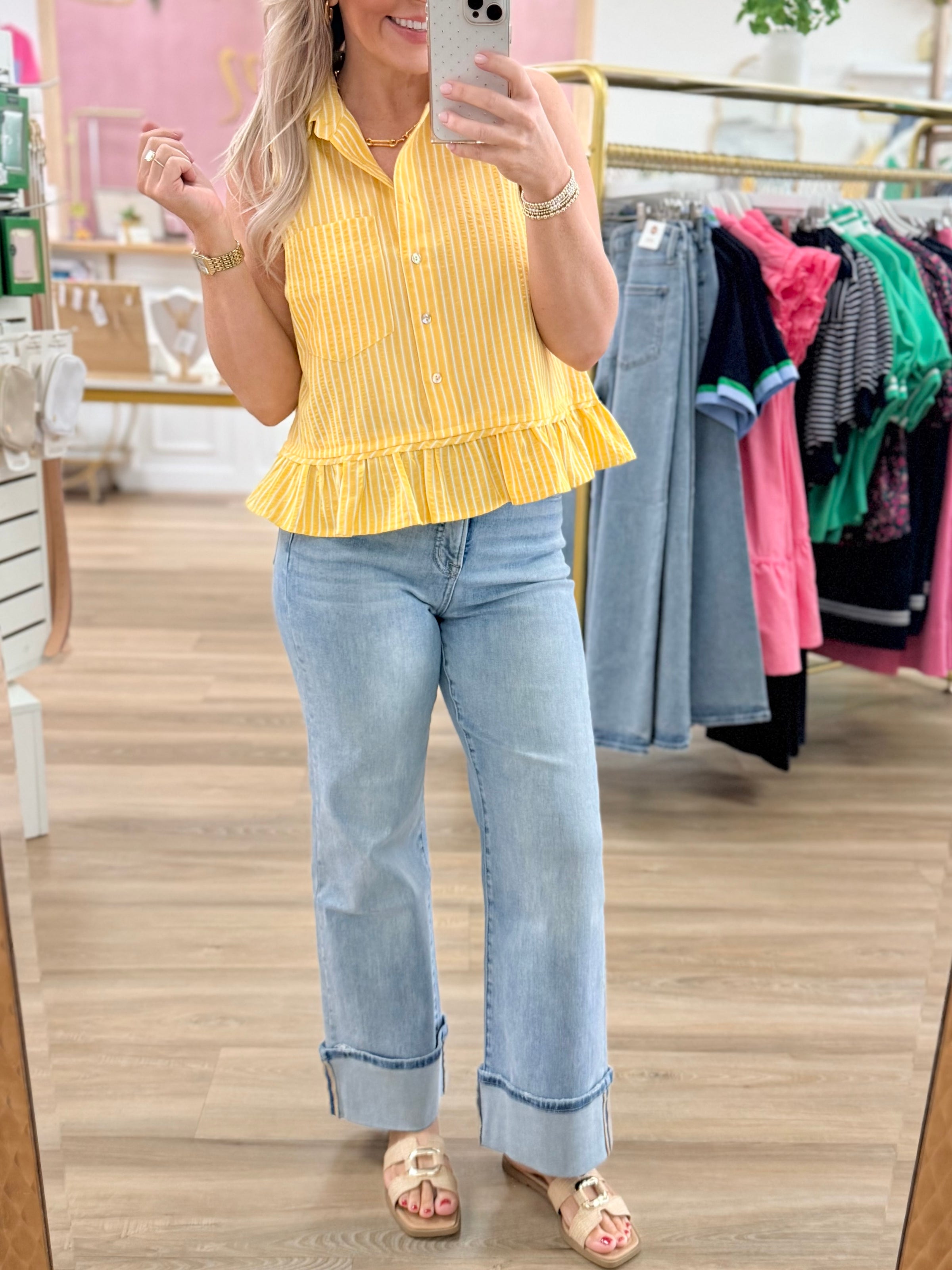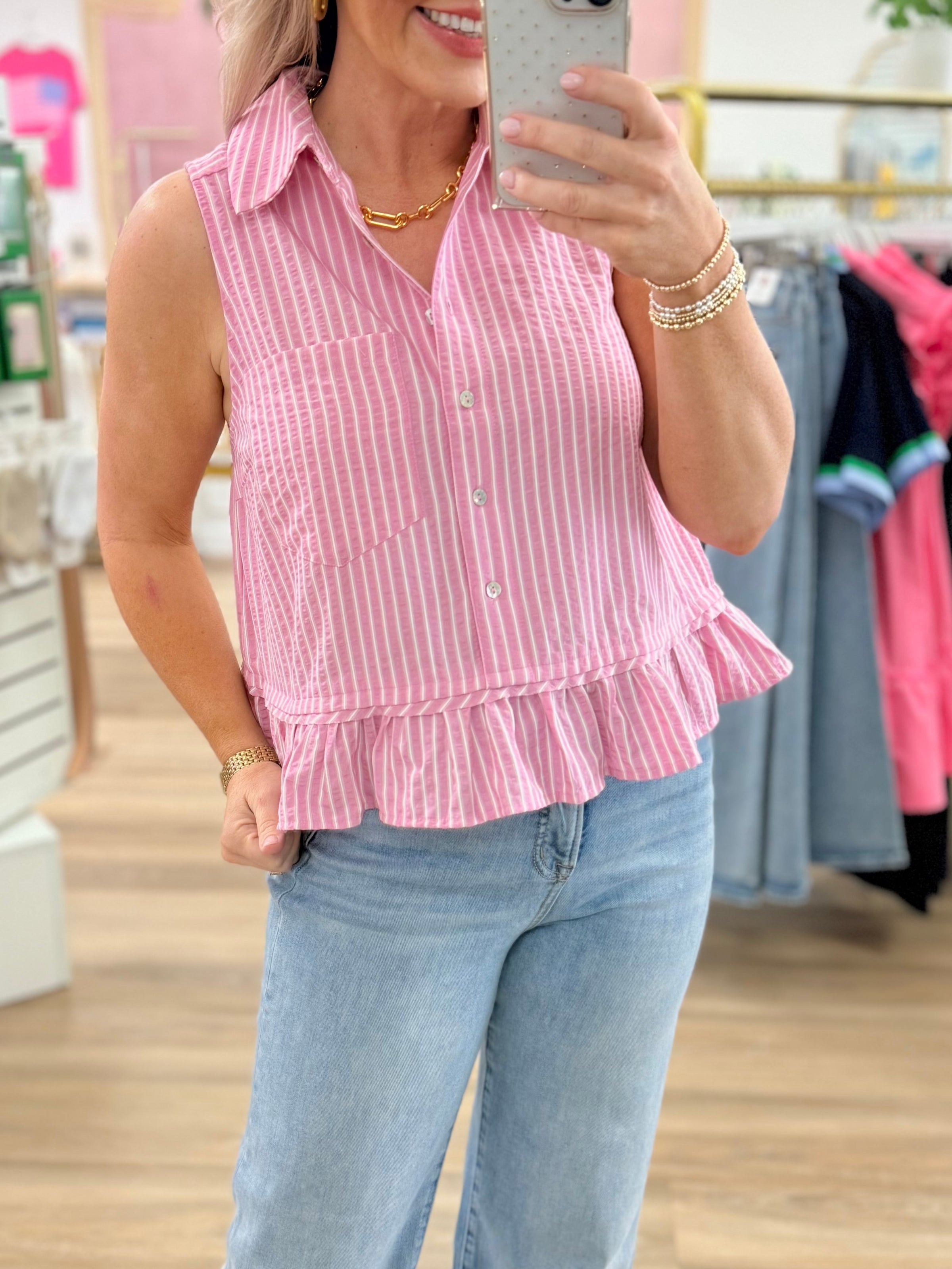 Sleeveless Stripe Ruffle Trim Top