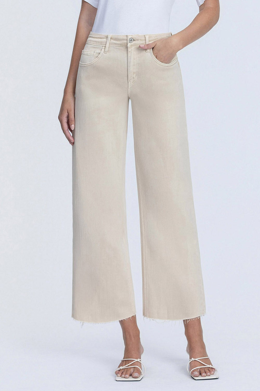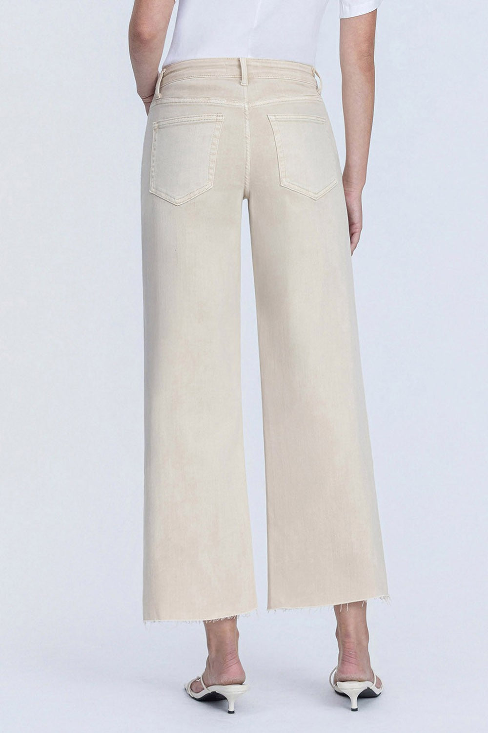 HIGH RISE CROP WIDE LEG JEANS COMFORT STRETCH DENIM, HIGH RISE WAIST, 5 POCKETS, CLEAN CUT RAW HEM, CROPPED LENGTH, WIDE LEG JEANS F. RISE: 10" / INSEAM: 26 1/2" / LEG OPENING: 20"