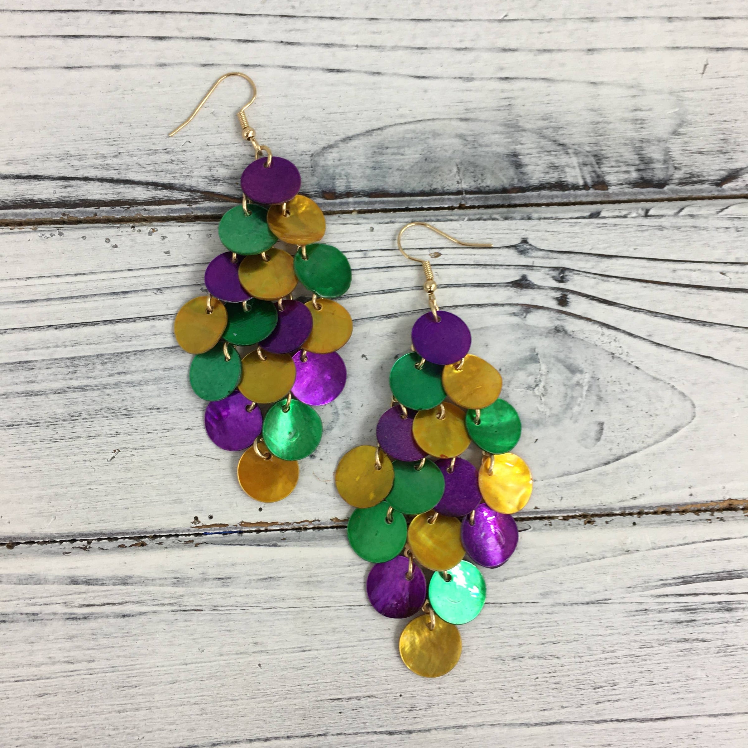 Mardi Gras shell disc diamond shape earrings! These measure approximately 3 inches long.