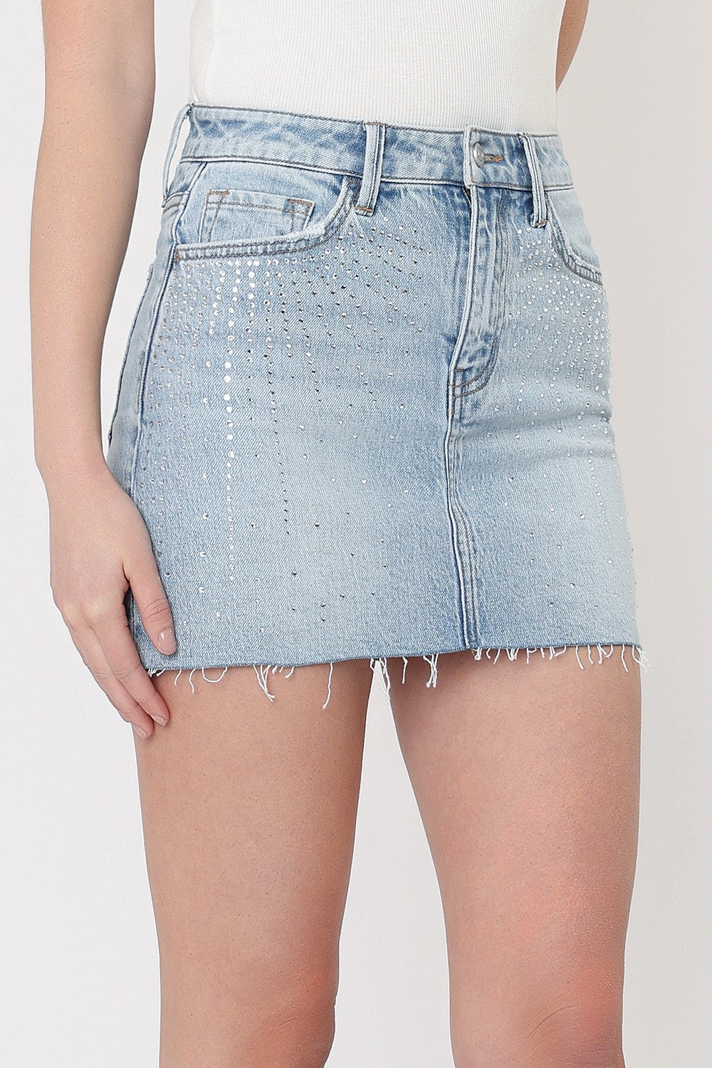 MID RISE RHINESTONE EMBELLISHED MINI SKIRT COMFORT STRETCH DENIM, MID RISE WAIST, 5 POCKETS,