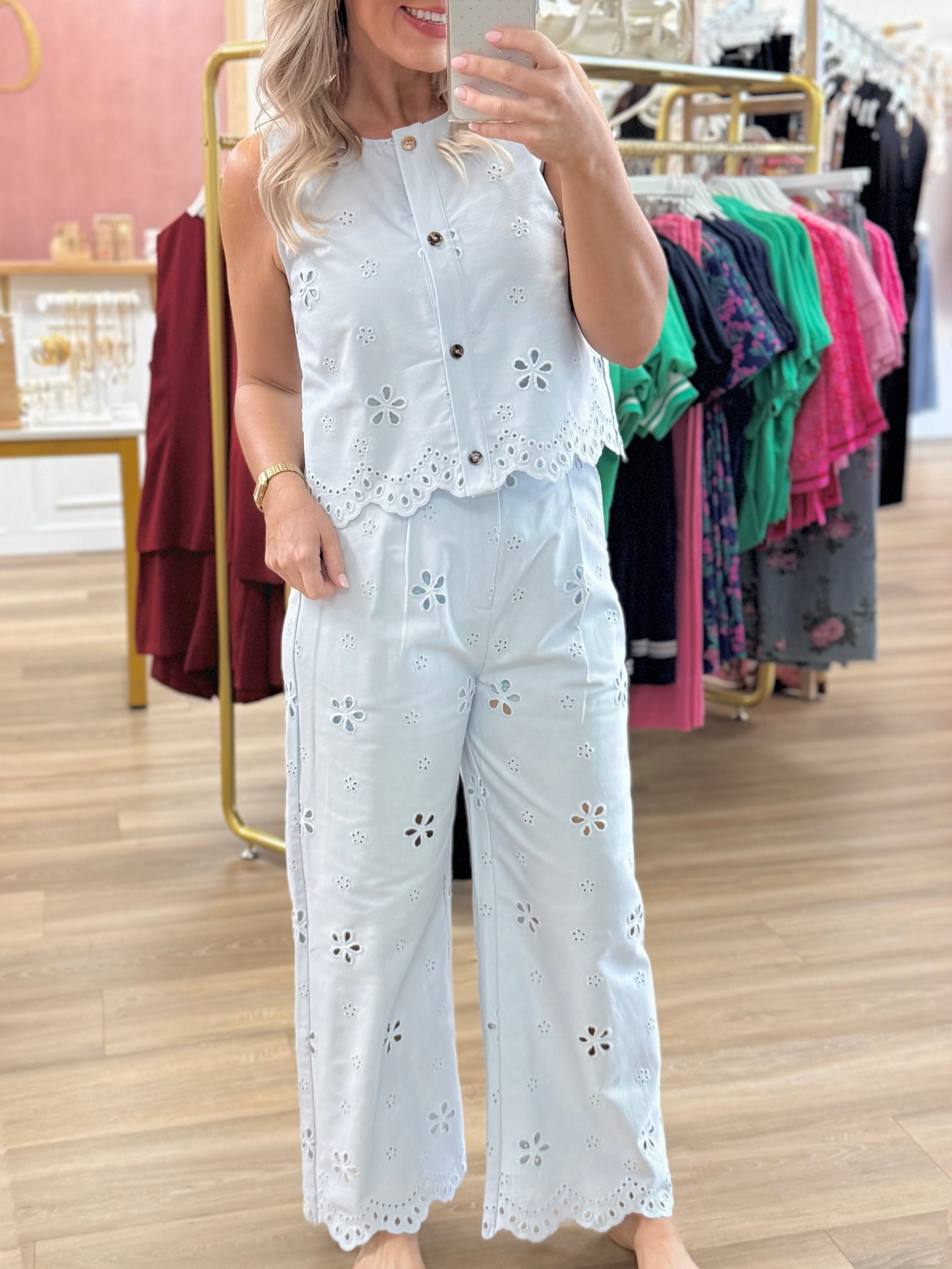 Eyelet embroidered sleeveless crop top featuring scallop hem and button closure at front. Lined.