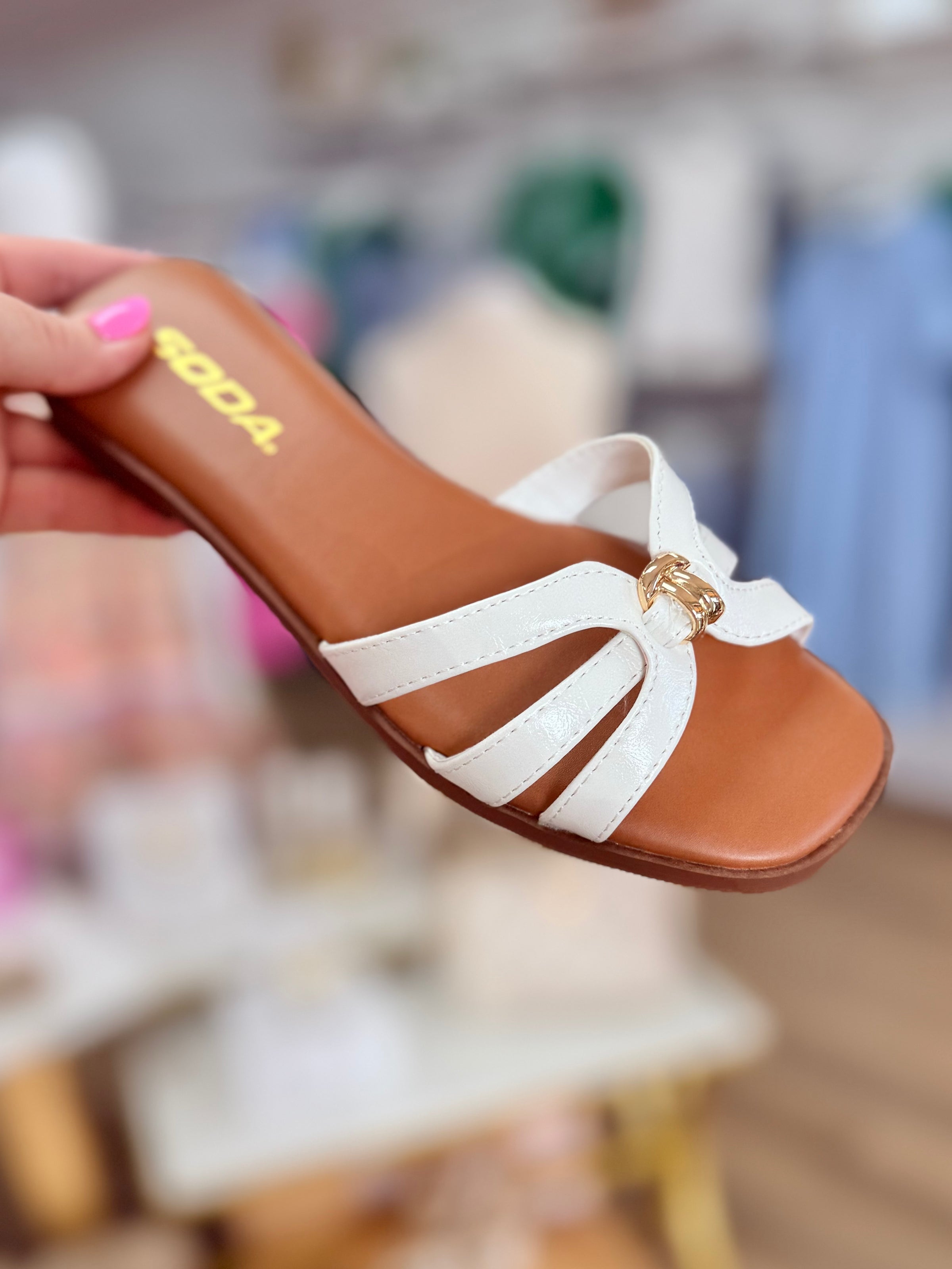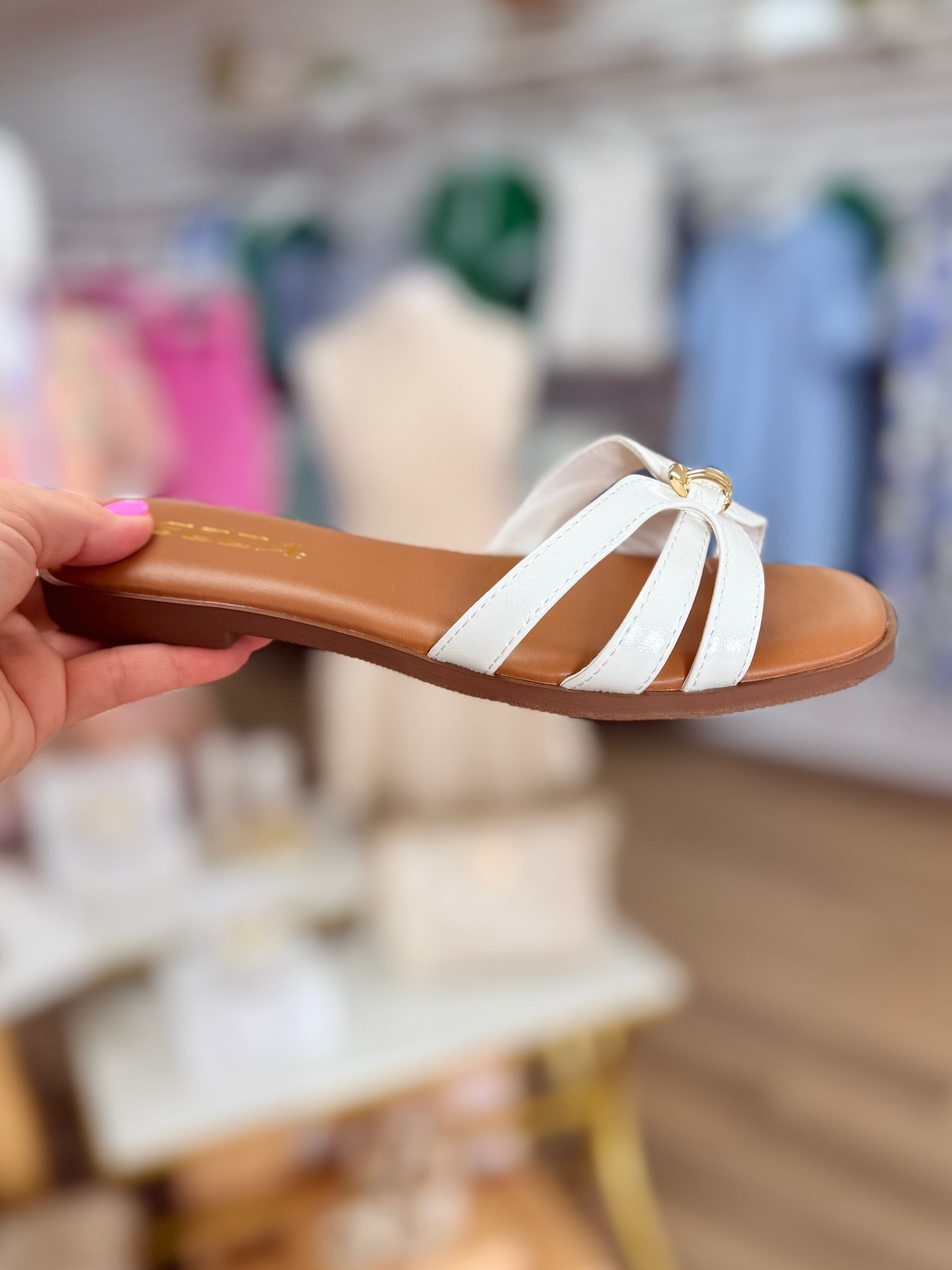 the Myrtle Sandal in white.  Flat slip-on style.