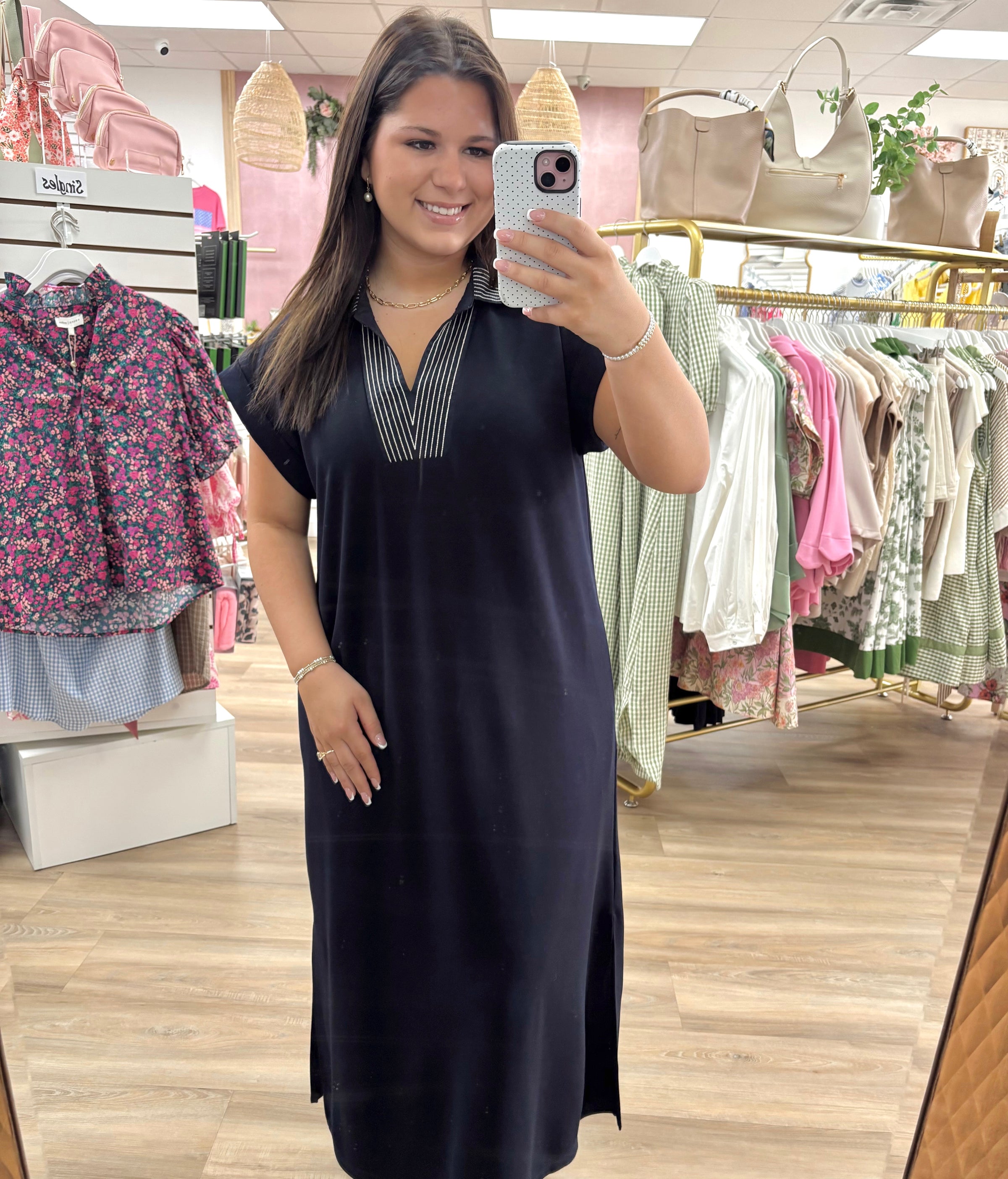 Short drop shoulder solid midi dress with side slit, stitch detail front neckline & collar, side pockets.